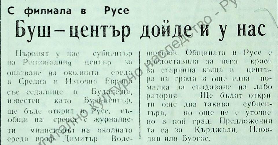 | Място на издаване | Първият у нас субцентър на Регионалния център за опазване на околната среда в Средна и Източна Европа със седалище Будапеща, известен като Буш-център, ще бъде открит в Русе. |