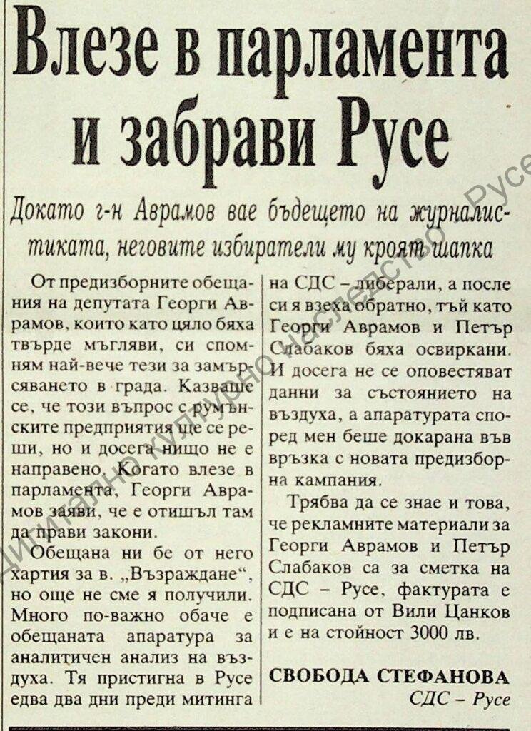 Място на издаване Обвинения срещу народния представител Георги Аврамов, неотстоял предизборните си обещания за борба с химическото замърсяване в района Русе – Гюргево