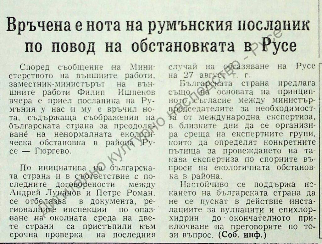 | Заглавие | Връчена е нота на румънския посланик по повод обстановката в Русе |