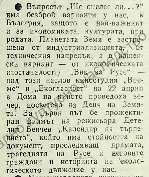 | Място на издаване | Вечер по повод Деня на земята, организиран от киностудия „Време“ и „Екогласност“ под надслов „Вик за Русе“; премиера на филма „Календар на търпението“ (реж. Детелин Бенчев), проследяващ трагедията на русенци и историята на екологичното движение у нас. |