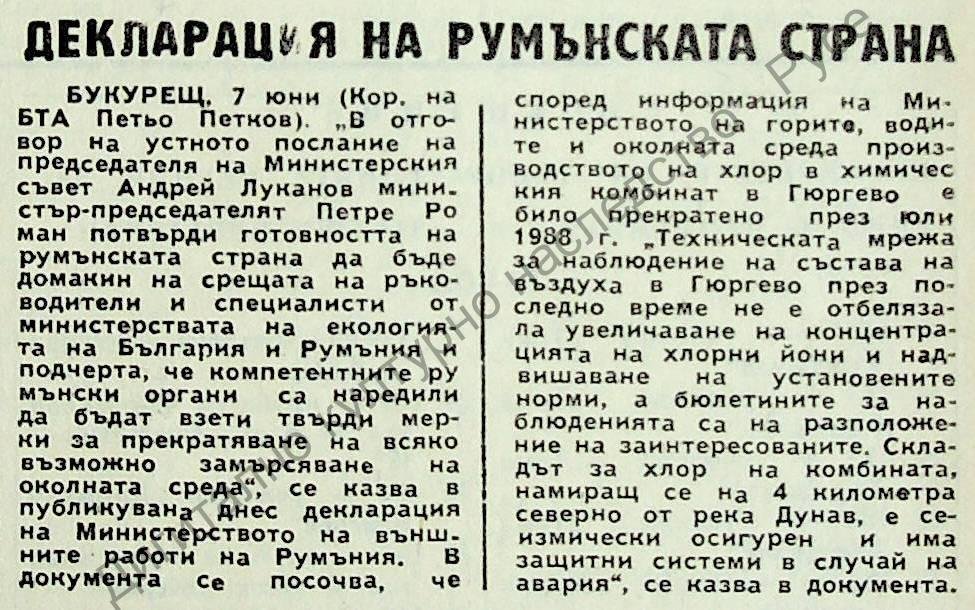 | Място на издаване | Министерството на външните работи на Румъния декларира, че замърсяването с хлор е невъзможно, тъй като производството му е прекратено още през юли 1988 г |