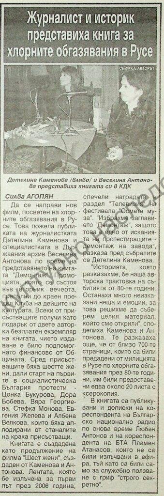 | Място на издаване | Детелина Каменова от РТВЦ – Русе и Веселина Антонова от Държавния архив за книгата си „Демонтаж“. |