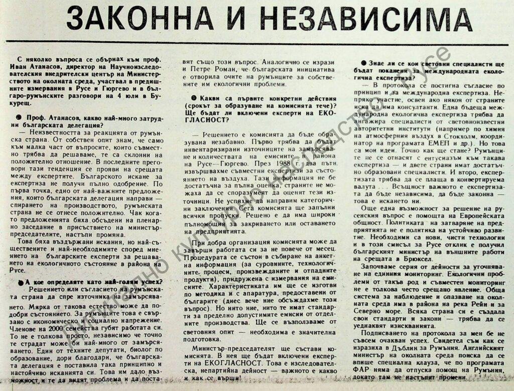 | Място на издаване | "Подпис: Детелина Ангелова. Разговор с директора на Научно-изследователския внедрителски център на Министерството на околната среда, участвал в българо-румънските разговори. Русе се усмихна? – водеща тема на броя " |