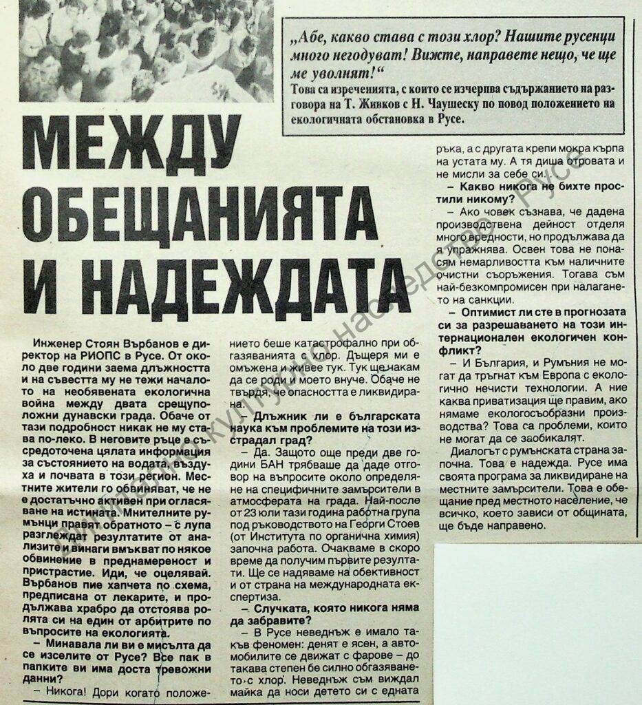 | Място на издаване | "Подпис: Мария Шалаверова. Разговор с директора на РИОПС – Русе за екологичната обстановка в града. Тема на страницата – Град Русе в отровната прегръдка на Менделеевата таблица. " |