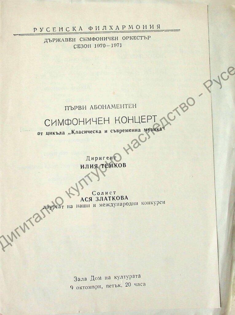 | Заглавие | Първи абонаментен симфоничен концерт от цикъла "Класическа и съвременна музика" |